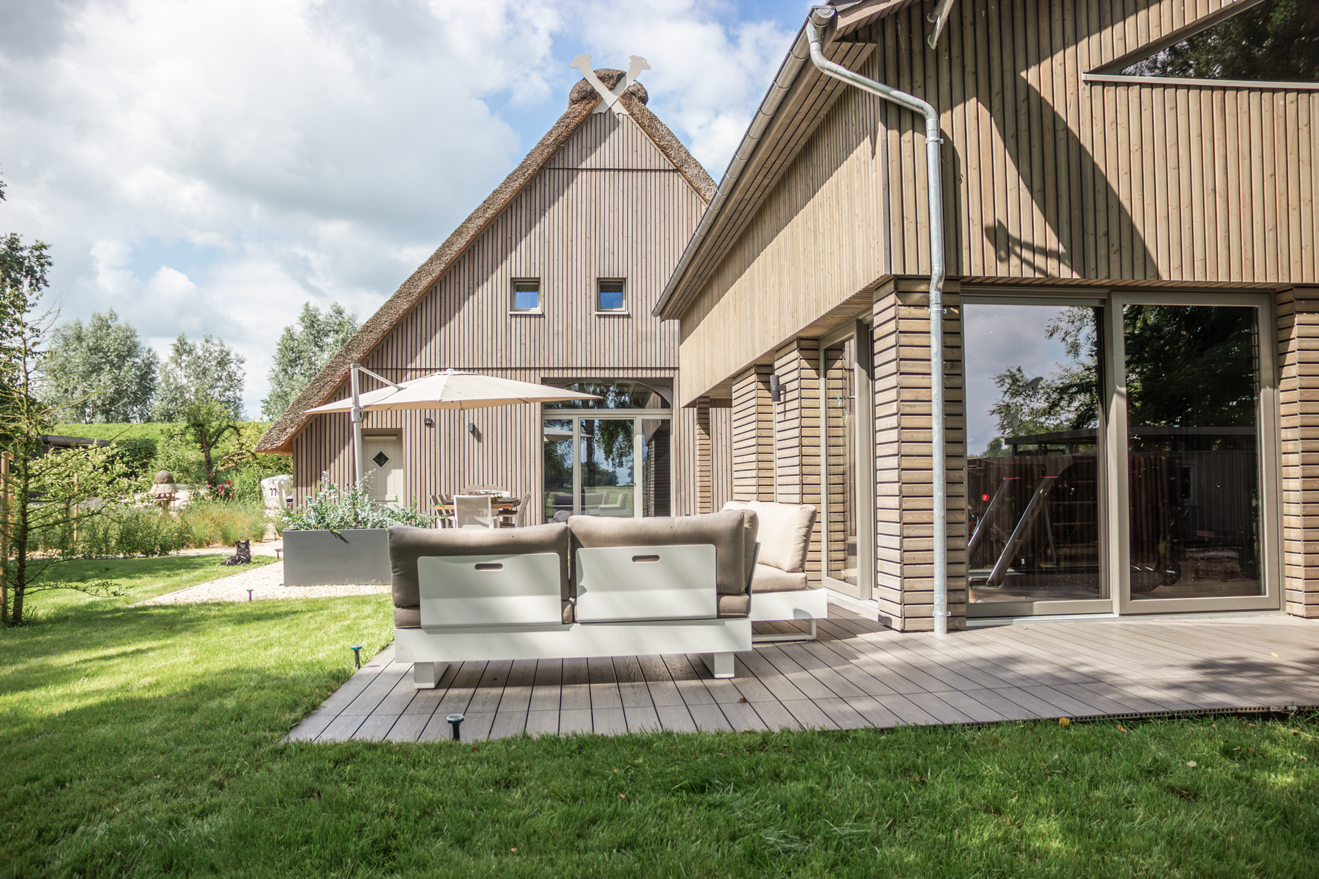 Ein separater, hochwertig ausgestatteter Fitnessbereich mit Peloton-Geräten bietet Raum für Bewegung und Erholung. Mehrere großzügige Terrassen laden zum Verweilen ein - mit Blick auf die angrenzende Pferdekoppel und die weite Natur ringsum.